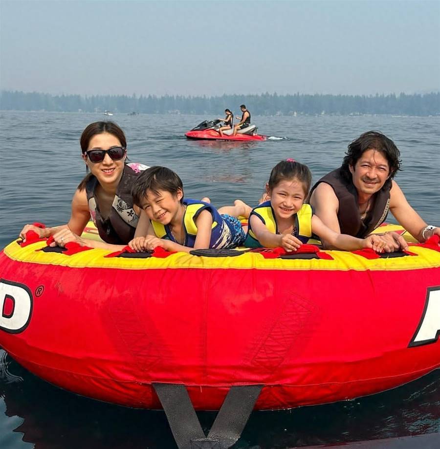 鐘嘉欣和老公帶著孩子們玩水上沖浪,這麼干凈的海水且玩且珍惜。
