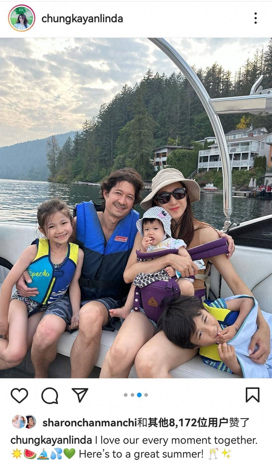 9月9日,鐘嘉欣分享一家五口全家福,罕見和年長13歲的老公同框秀恩愛,她說自己喜歡和家人在一起的每一個時刻。