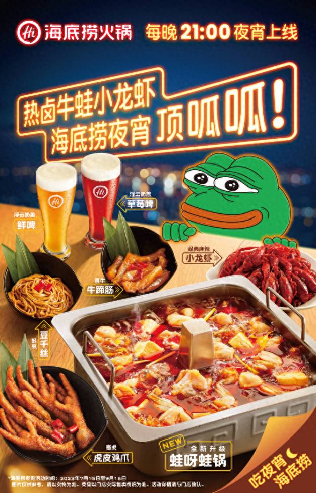 近几年,海底捞为了迎合夜经济,屡推夜宵新品,如牛蛙锅、捞派人气九宫格、热卤耙鸡爪、热卤大猪蹄子、独家口味的小龙虾、自有品牌精酿啤酒等。