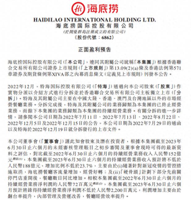 持续经营业务净利润预计超22亿元人民币,是海底捞自上市以来最好的年中净利润“成绩单”。