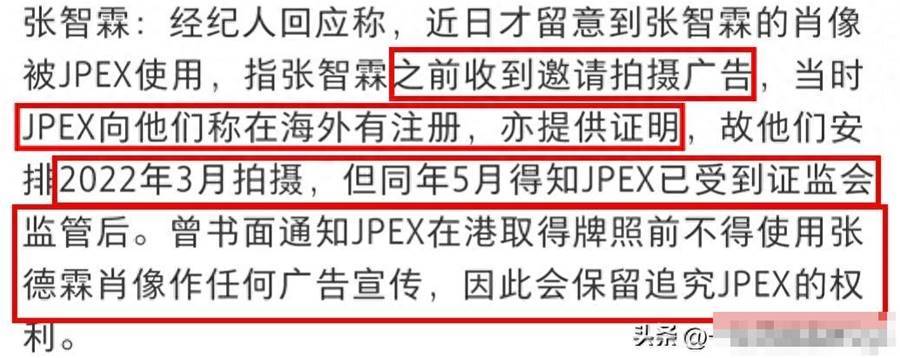 經紀公司表示,張智霖是在2022年3月為JPEX拍攝,但同年5月得知JPEX已受到證監會監管后。曾書面通知JPEX在港取得牌照前,不得使用張德霖肖像作任何廣告宣傳。