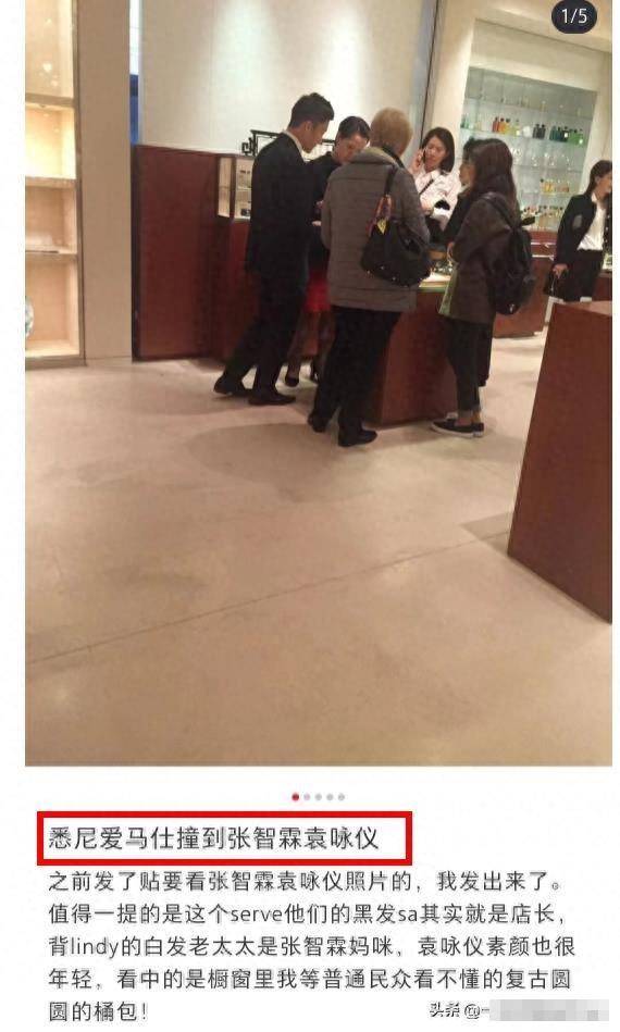 不止在國內買,張智霖袁詠儀還跑到國外買買買。早年便有網友在悉尼的愛馬仕店撞到了張智霖和袁詠儀。偶遇者還感覺袁詠儀看中的都是「普通民眾看不懂的復古圓圓的桶包」。