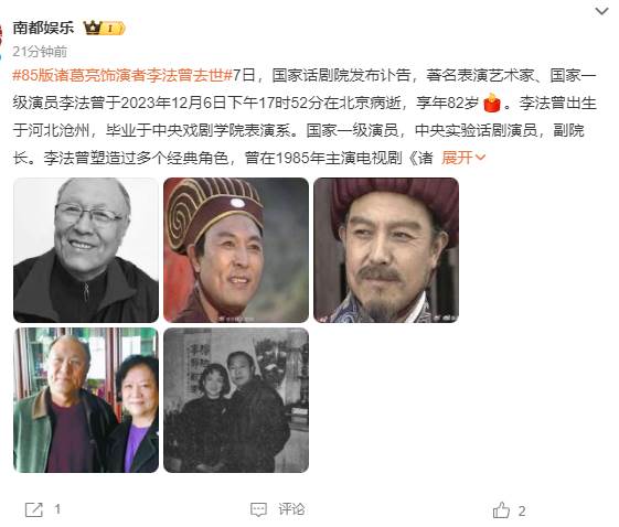演藝圈再傳噩耗!著名表演藝術家、85版電視劇《諸葛亮》中「諸葛亮」的飾演者李法曾,