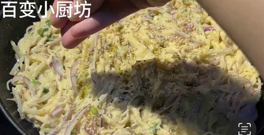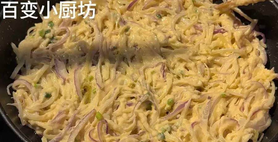 平底鍋燒熱,往里面倒入少量的植物油,油大概六成熱的時候,將我們調好的洋蔥、土豆絲倒進鍋里面,接著用筷子將它攤開,攤成一個餅狀,攤得越薄越好,這樣吃起來更加的清脆可口。