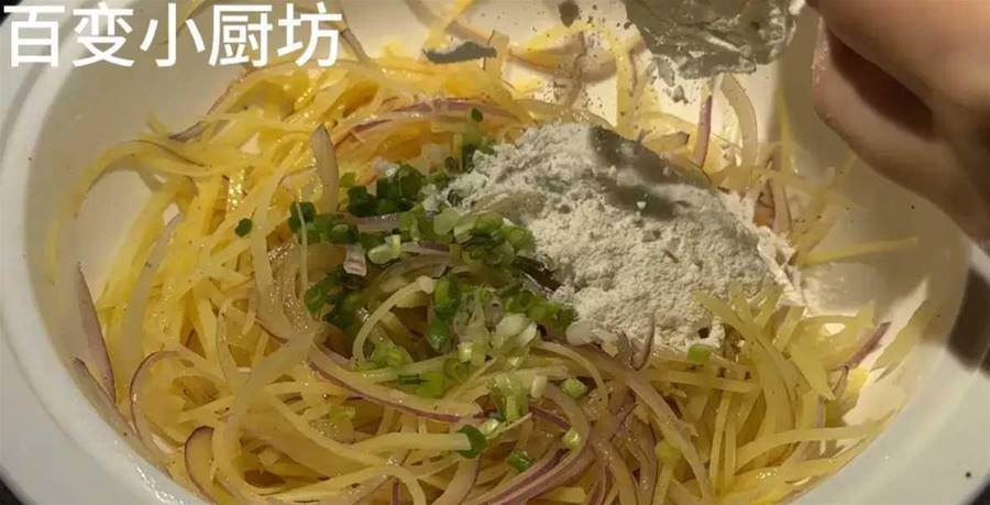 洋蔥本來就比較干凈,而且用鹽水浸泡過后更是非常干凈了,所以我們只需要加清水淘洗一次,將表面多余的鹽分淘洗掉就可以了。淘洗干凈后,我們把表面的水分稍微擠一擠,水分也不要擠得太干,只要洋蔥絲表面不滴水就可以了。