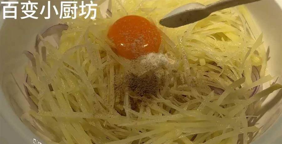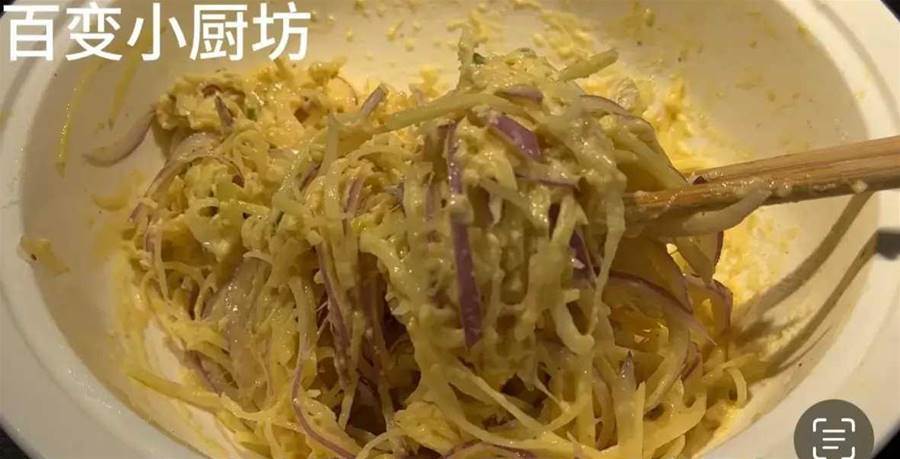 用筷子把雞蛋打碎后攪拌均勻,讓里面所有的材料都充分的混合在一起,我們可以看到里面的洋蔥絲和土豆絲粗細都是差不多的,非常的細。
