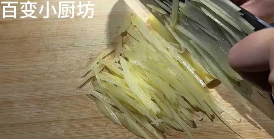 然后將土豆片搟成這種粗粗的細絲,切的越細越好。很多朋友可能切土豆絲不太擅長,那麼這個時候就可以用家里面的擦絲器來擦了,土豆是我們生活中非常常見的一種蔬菜,很多朋友都特別喜歡吃,而且它的吃法也特別的多,像炒土豆、燉土豆、燜土豆、烤土豆等等,用來涮火鍋也特別的香。