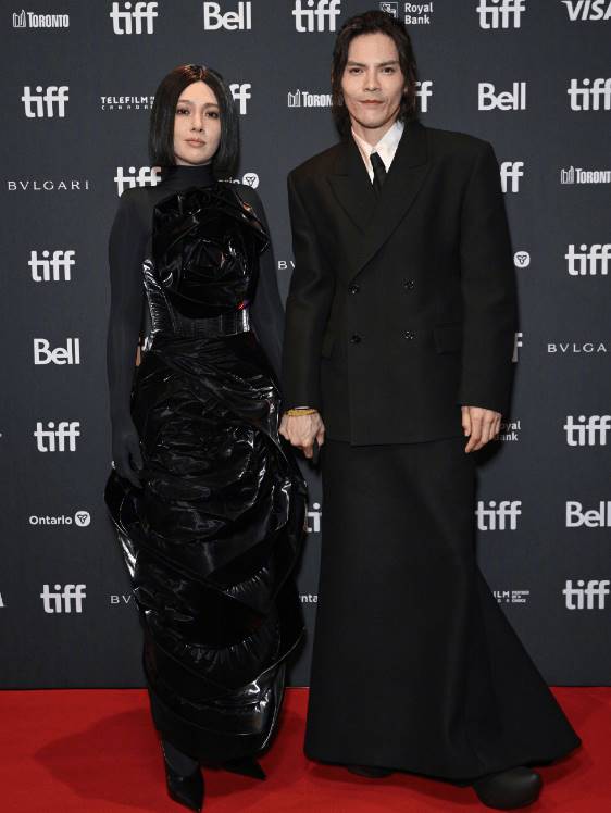 9月13日,郭碧婷和向佐現身多倫多參加電影節,兩個人一身暗黑系走紅毯。男方上半身穿著黑色制服外套,里面是白色襯衣,下半身居然穿著西服長裙,還是那種很顯身材的,看起來有點詭異。