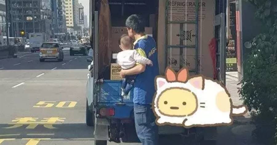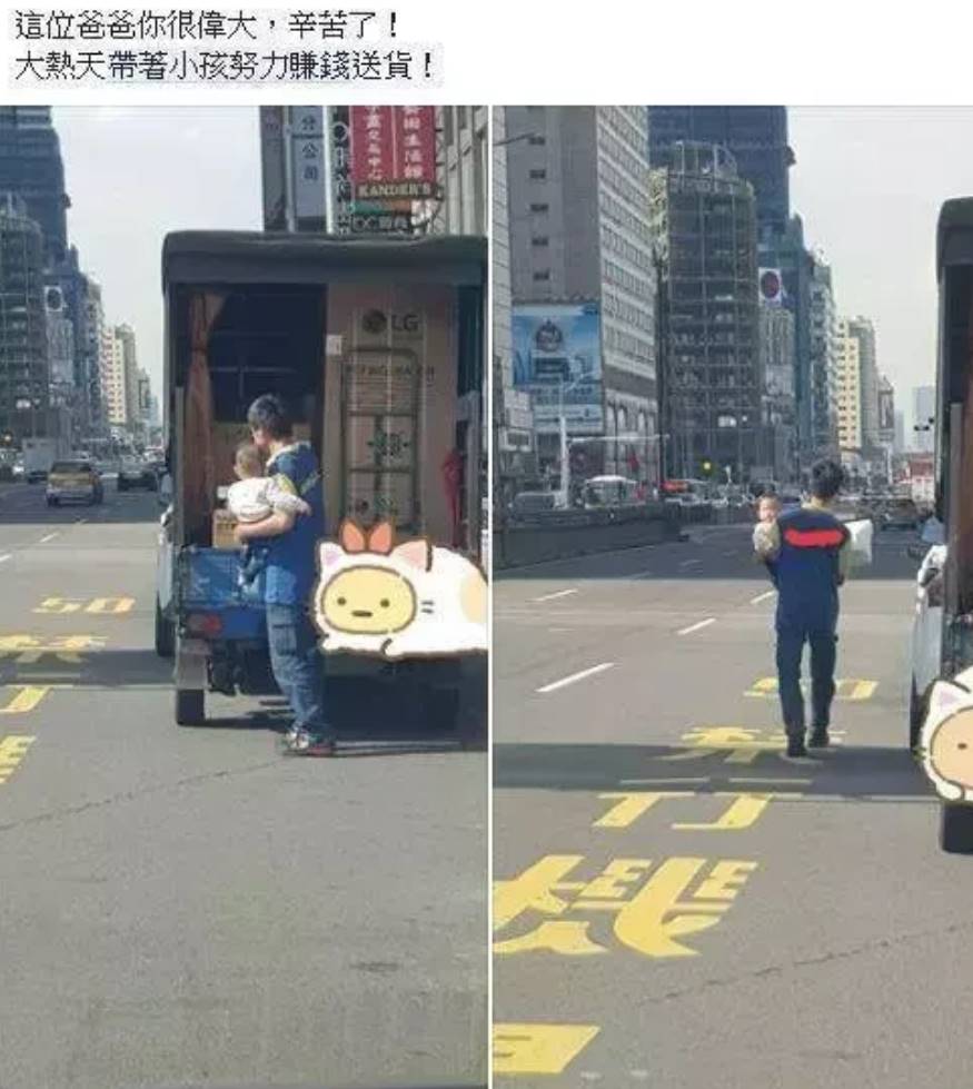 一位網友近日在臉書社團「爆廢公社」分享兩張照片,在其中一張照片裡,這位送貨員爸爸先是將貨車停放在路邊,這時的他便用左手抱著年幼的孩子,右手則從貨車拿下貨物。在另外一張照片裡,爸爸則是一邊抱著孩子一邊拿著物品,準備將物品送至客人的手上,即便抱著小孩很吃力很不方便,他仍盡力地完成份內的工作,實在是讓人很敬佩阿!原PO目擊了完整過程,並將畫面拍下上傳,雖然因為爸爸的舉動深受感動,卻也忍不住感到心疼,「這位爸爸你很偉大,辛苦了!大熱天帶著小孩努力賺錢送貨!」