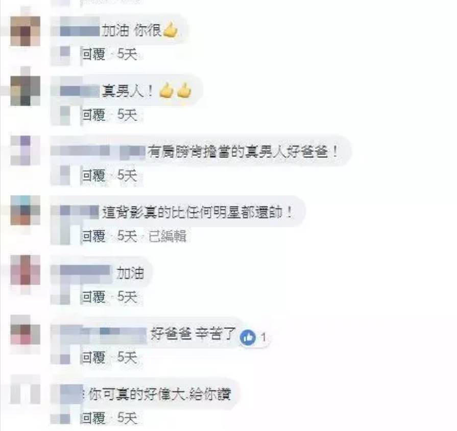 照片一曝光後,立刻引起熱烈迴響,許多網友紛紛留言大讚,「 好有愛的畫面,現在願意帶孩子的男人可能快絕種了吧」、「認真的好爸爸最帥」、「 爸爸真的好偉大」 、「不知道為什麼看了鼻子有點酸酸的」、「 這背影真的比任何明星都還帥」 ,「這位爸爸送的不是貨,而是一家的生計」。