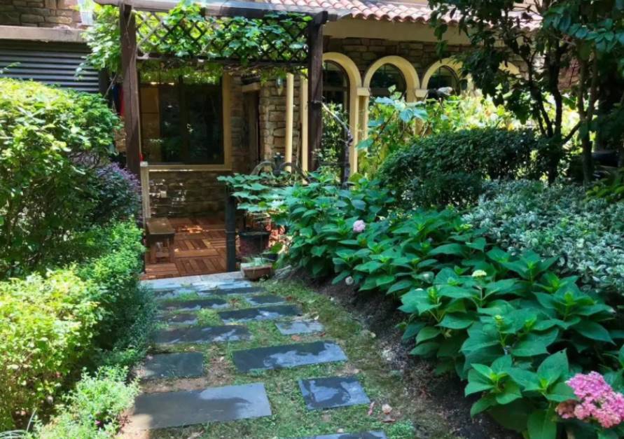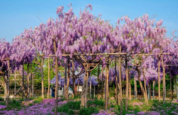 只要有花園,都會選擇去搭一個架子,在底下放上幾張桌子,喝喝茶,坐那聊聊天都是非常不錯的,對于廊架植物,我們可以選擇紫藤,紫藤品種非常的多,能夠耐零下二三十度的低溫,長勢也非常的快,一棵大苗一年的時間就能夠將整個架子爬滿,到時候春季開花非常的美。