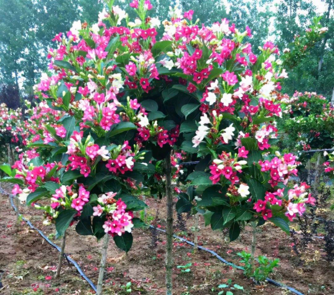 五彩錦帶是屬于木本植物,它開花的時候開出來的花有白色,粉色,紅色,紫色,花色非常的多,一樹多色,它不是嫁接的品種,是一棵一個花開出來有多種顏色,開花的時候五彩繽紛,非常的漂亮。