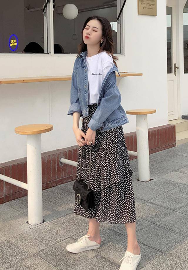 二:去歷下,選擇藍色牛仔外套,搭配黑色圓點襯衫。